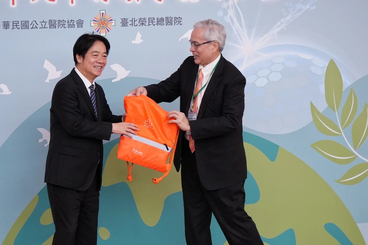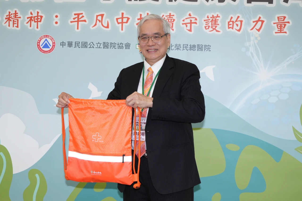 談到醫療韌性的實踐,公立醫院協會理事長、台北榮總院長陳威明今天在現場,首發「防災包1號」,包含電池、水袋、壓縮毛巾、衛生袋等基本防災物資,同時呼籲企業認領捐贈,擴大防災力量,盼能呼籲政府普發防災包。