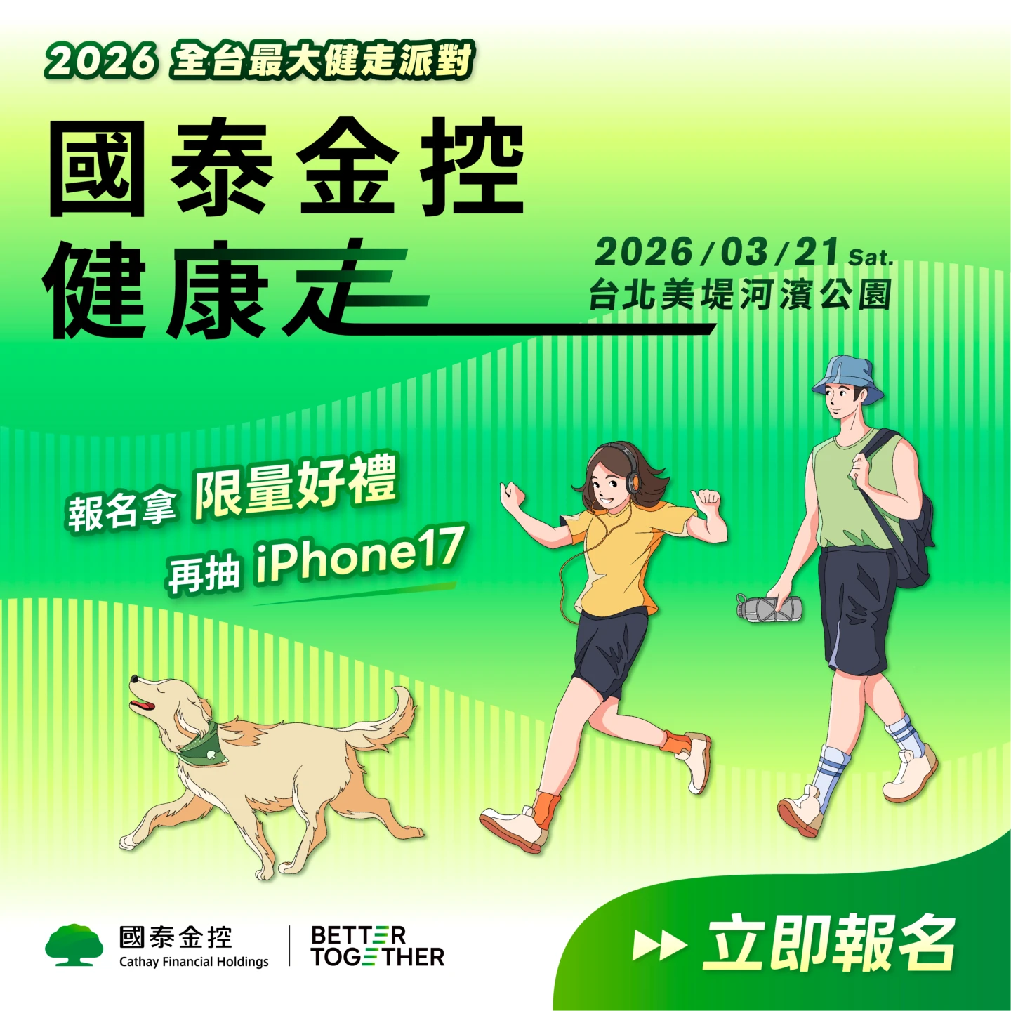 「2026國泰金控健康走」不僅是一場運動盛事,更是一場結合健康、樂活與公益的全民盛會。國泰金控誠摯邀請民眾揪親朋好友一起共襄盛舉、帶上毛孩,一同於2026年3月21日齊步出發,為自身累積健康能量,也為社會注入正向力量,走出健康未來,共創更好!