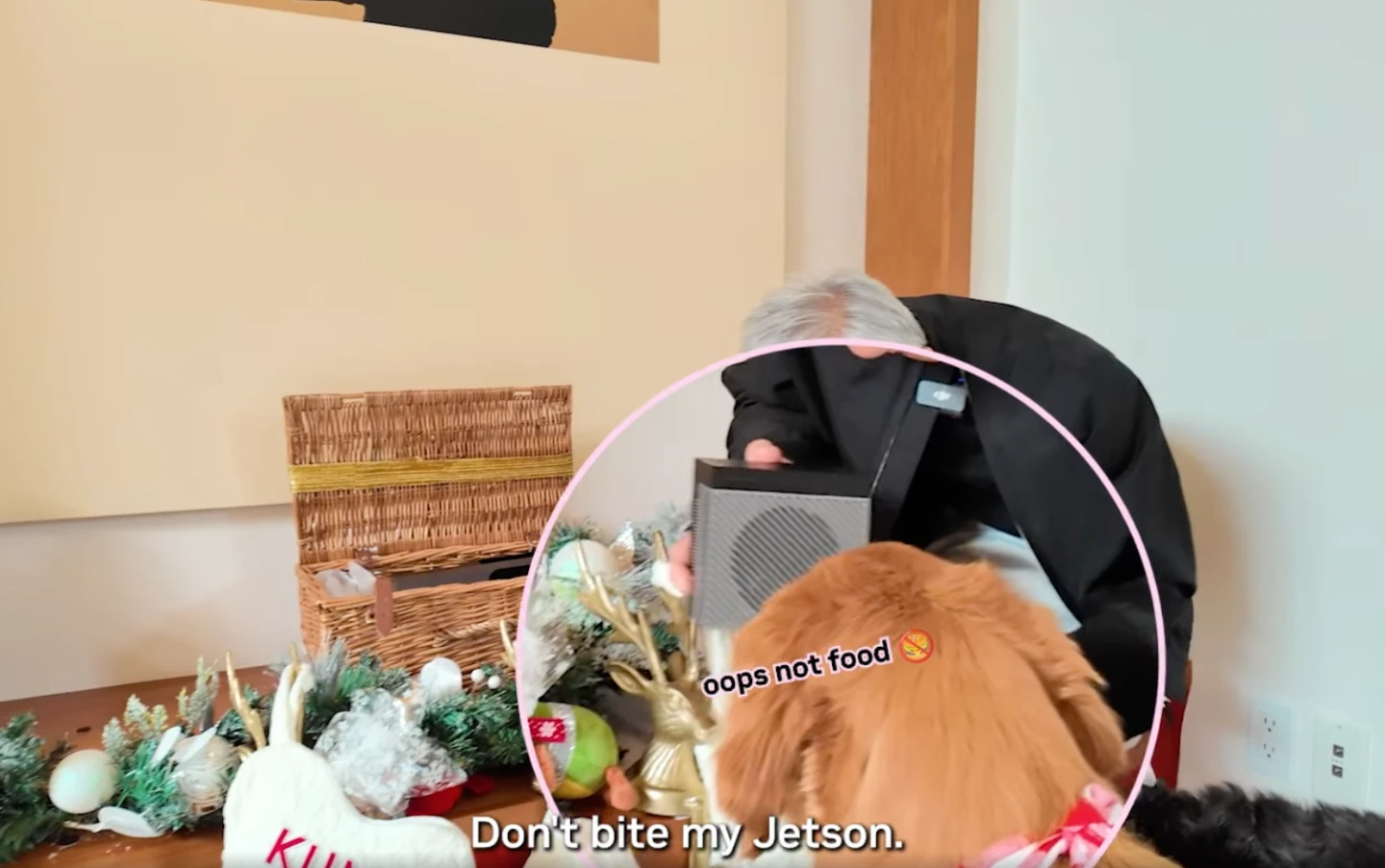 還有另一幕是狗狗以為是食物而好奇張嘴咬了AI機器人電腦,令黃仁勳嚇到大叫「別咬我的Jetson」,令這支畫面溫馨的影片增添不少笑料。