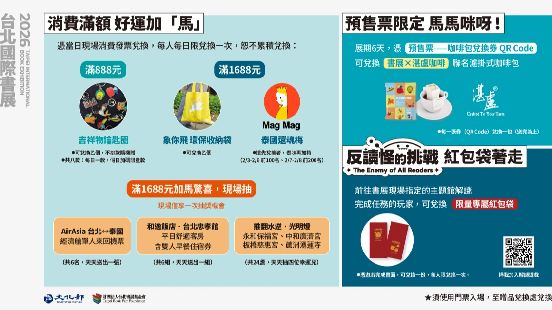 台北書展基金會董事長郝明義說明,2026年書展共匯集了來自29個國家、國內外509家出版社參展,並有超過60位國際作家來台共襄盛舉。為了容納豐富的展出內容,除了二樓展區外,今年還特別加入了「小誌展(Reading is amaZINE)」特別展區,以及結合解謎遊戲的「反讀怪的挑戰」活動路線,試圖將靜態閱讀轉化為動態體驗。