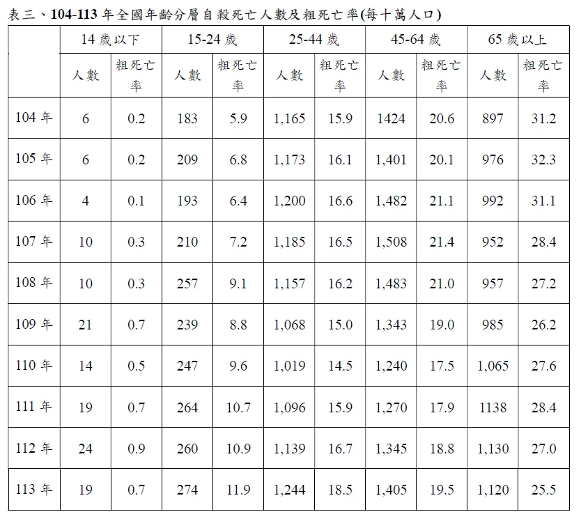 根據衛生福利部統計近十年全國輕生數據,2015年全國輕生死亡人數從3675人到2024年的4062人,顯示輕生人數逐年攀升。其中統計14歲以下的輕生人數也有增加趨勢,從2015年的6人,到2023年增為24人,2024年也有19人。15到24歲輕生死亡數字也從183攀升到274人。