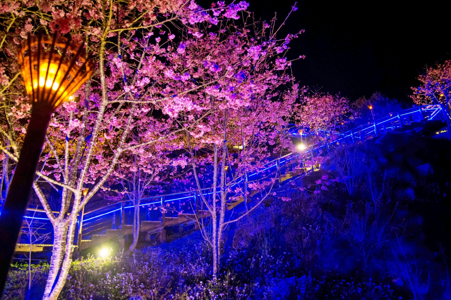 其中「櫻之道」雖長度較短卻最具看頭,放眼望去,滿目粉紅花海,清風吹拂,悄悄落下櫻花雨,入夜在燈光映襯下,別有一番意境,散發出如夢似幻的氛圍。