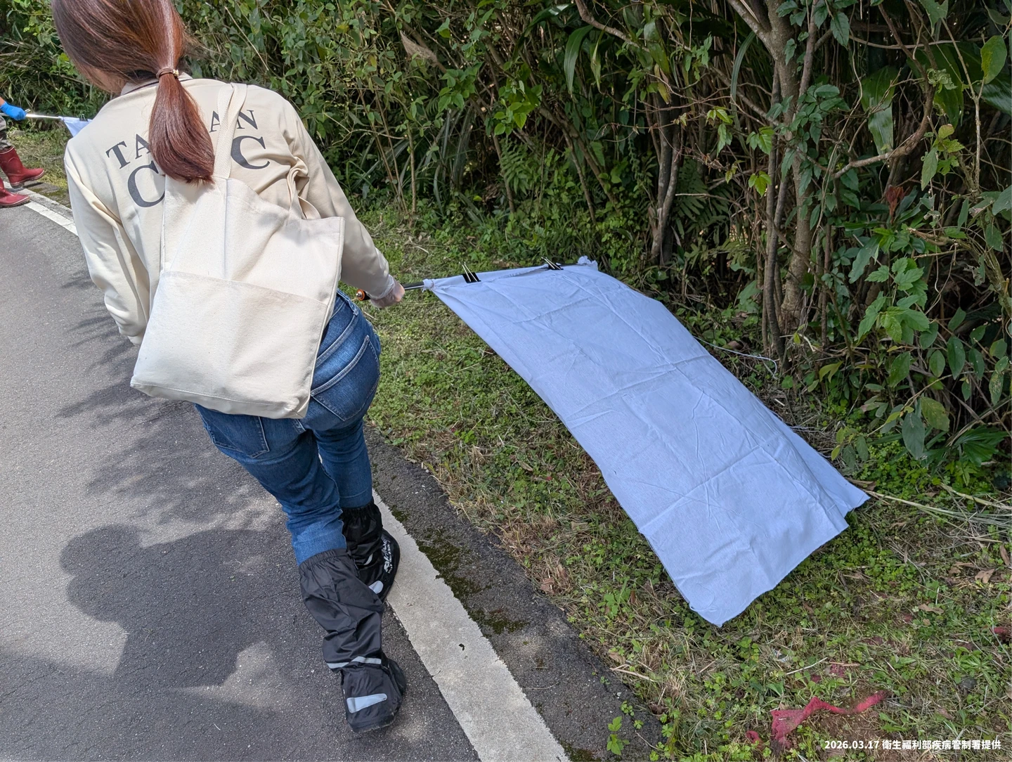 圖為旗幟法,將白色法蘭絨或棉布固定在長棍末端,在草叢表面或植被上方拖過來採獲蜱蟲。疾管署提供 zoomin