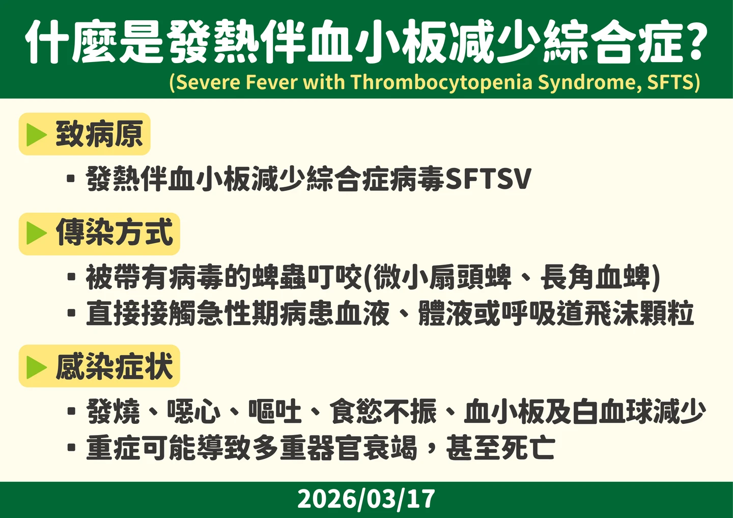 發熱伴血小板減少綜合症的致病原、傳染方式、感染症狀。疾管署提供