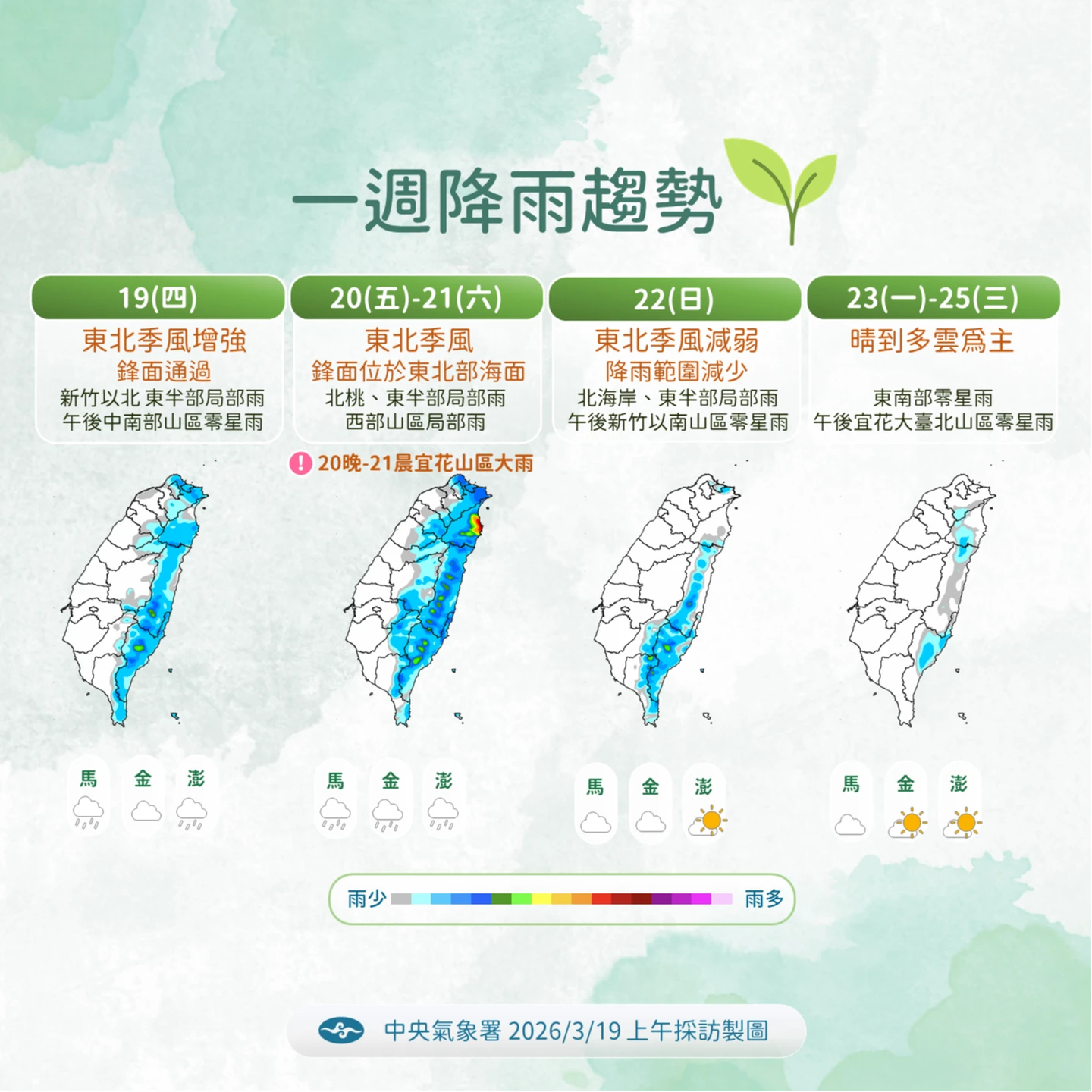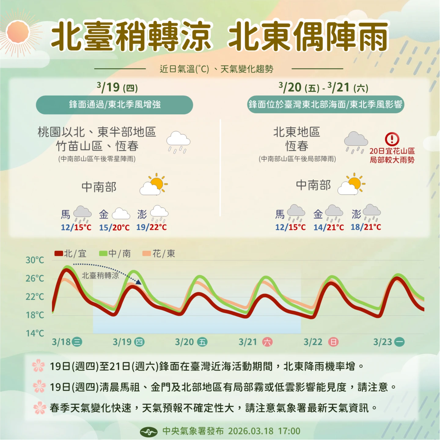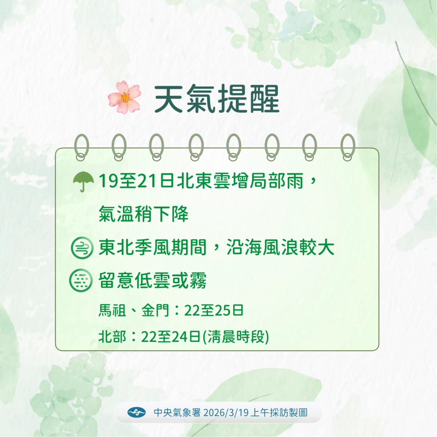 「周日之後,鋒面遠離、東北季風減弱!」台灣大學大氣科學博士林得恩經營的氣象粉專「林老師氣象站」指出,自昨日開始到明天(21日),春雨鋒面接力東移,位置就掛在台灣北部或東北部外海附近,局部地區環境水氣增加,但降雨區域相當侷限,迎風面的北部、東北部及東部地區有些降雨的機會、溫度也略下降。