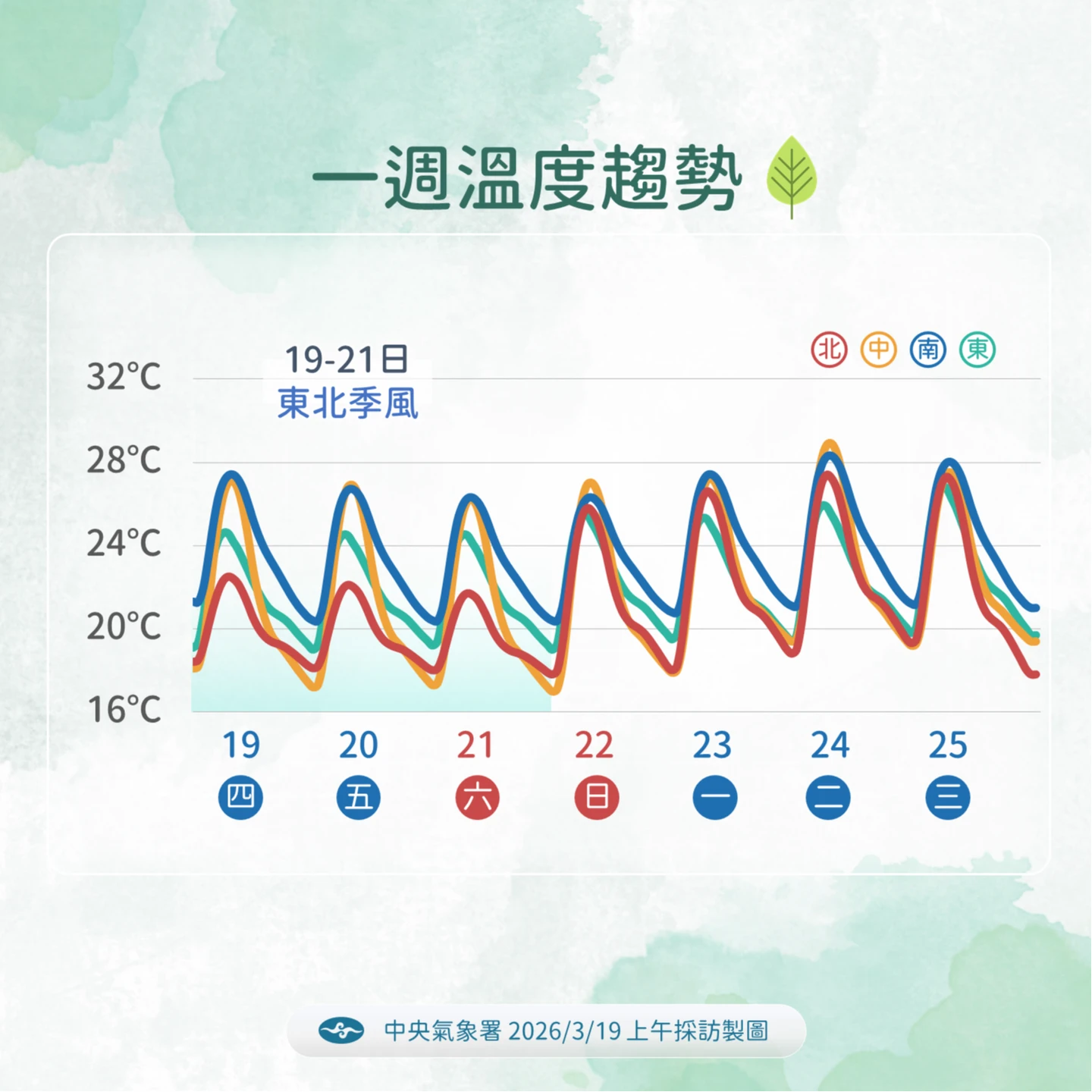 下周日(22日)東北季風將明顯減弱,北部及東北部氣溫重回上升軌道。除了東部、東南部與恆春半島仍有局部短暫雨外,其餘地區將恢復多雲到晴,午後僅新竹以南山區有零星短暫陣雨,是適合出遊的好時機。