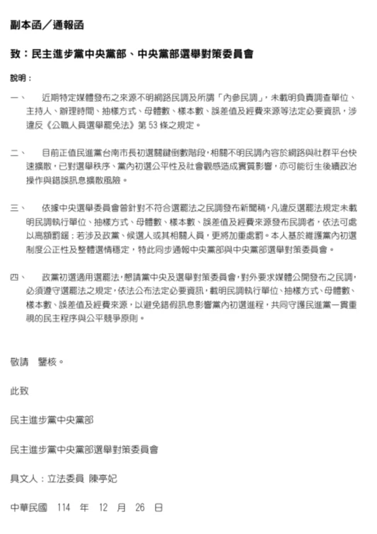 【記者施智齡/台北報導】民進黨台南初選戰況激烈,立委陳亭妃、林俊憲明晚將於電視台舉行政見發表會,交由1月12至17日間的民調決定誰出線,不過陳亭妃質疑近期多份來源不明網路民調,影響初選公平競爭,她今早發函通報中央黨部及2026選舉對策委員會,要求比照中選會標準採取必要作為,而黨中央也作出回應。
