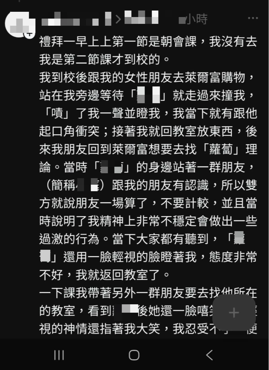 疑似加害學長的網友,今天透過網路社群發文791字還原事發經過,他說,禮拜一(24日)早上他跟女性朋友去便利商店購物,被迎面走來的學妹撞了,當下學妹說了「嘖」一聲還瞪他,雙方發生口角衝突,後續他先回教室放東西,隨後與朋友回到便利商店找學妹理論。