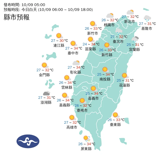 氣象署表示,今天(9日)東北季風持續影響,北部及東半部迎風面略降溫,高溫約31至33°C,中南部仍有32至34°C的高溫,南部局部達36°C。基隆北海岸、宜蘭及恆春半島偶有短暫陣雨,大台北與花東地區有零星降雨機率,其他地區為多雲到晴,午後南部地區及苗栗以南山區也有小範圍的雷陣雨發展。