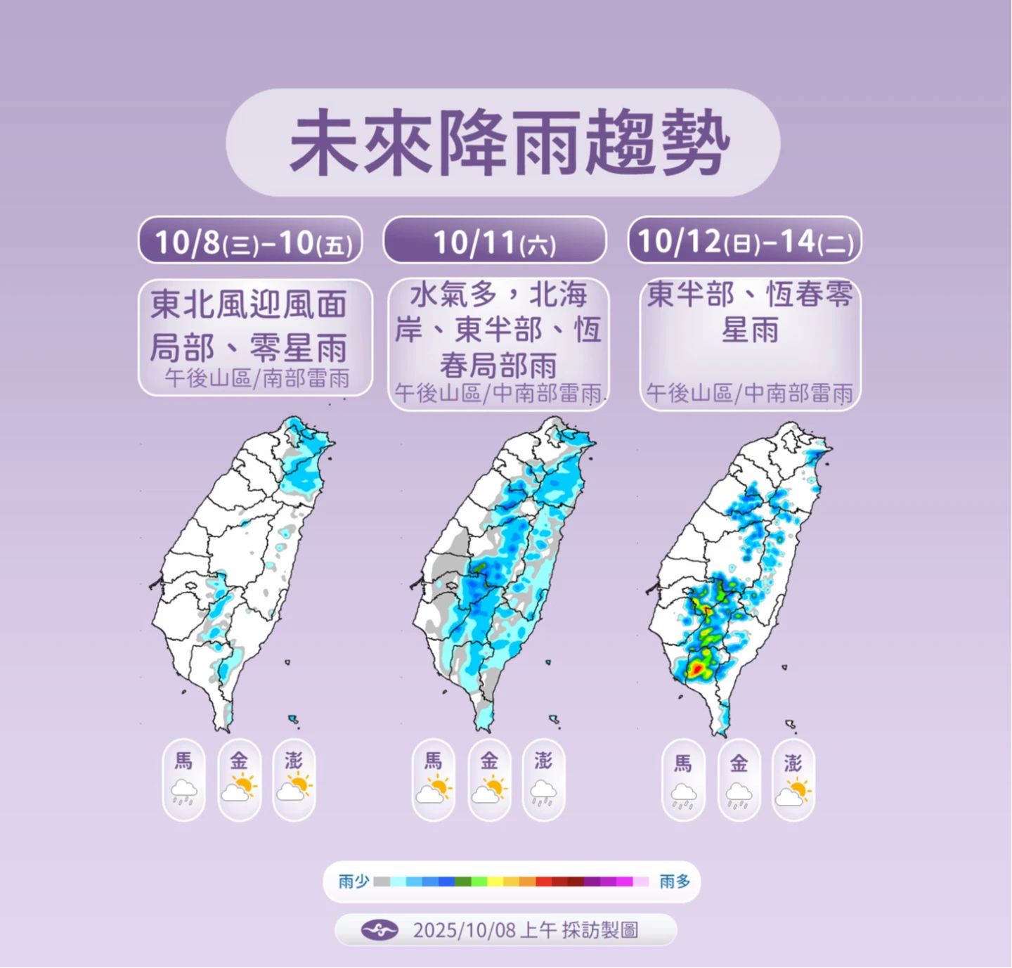 國慶日(10日)東北季風減弱,北海岸、東半部及恆春半島仍有局部短暫陣雨,西半部與離島多雲到晴,午後苗栗以南山區及南部地區有局部雷陣雨。