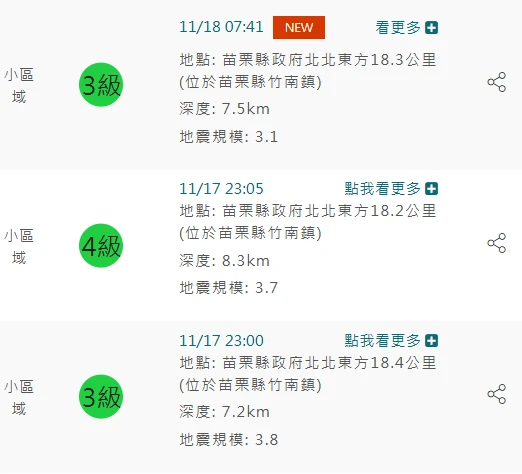 今早7時41分苗栗縣竹南鎮又再度發生地震,苗栗縣竹南鎮、苗栗縣後龍鎮最大震度3級,再度又感受到搖晃威力。