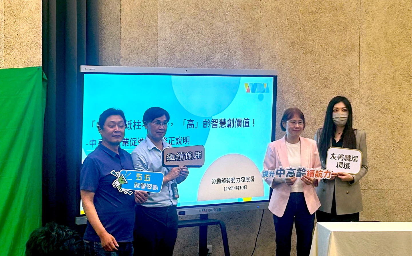 勞動部今天舉行記者會,宣布優化中高齡就業獎助措施。勞動部表示,為提升55歲以上中高齡者及高齡者的勞動參與,鼓2024年起推動「五五就業促進措施」,透過就業獎勵鼓勵勞工持續於勞動市場服務,及鼓勵雇主推動職場支持輔導,優化職場環境,去年已獎勵近5000人重返職場,協助近1500名勞工優化工作環境及條件。