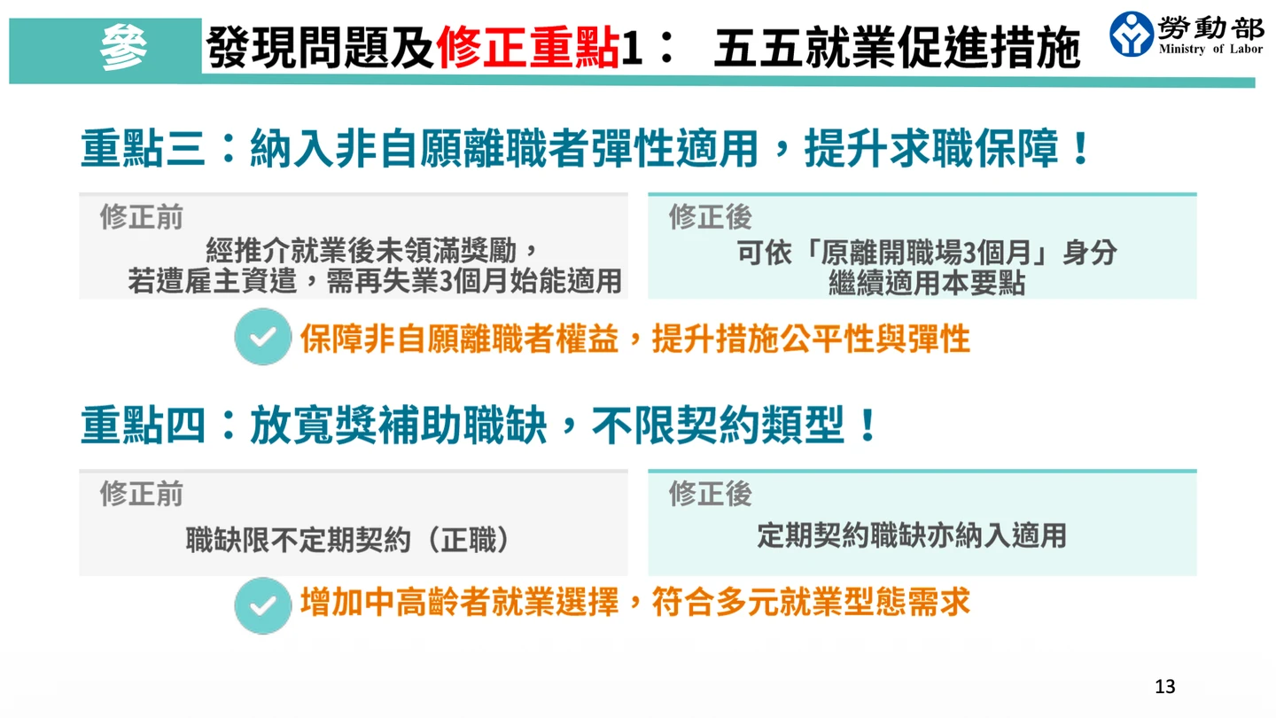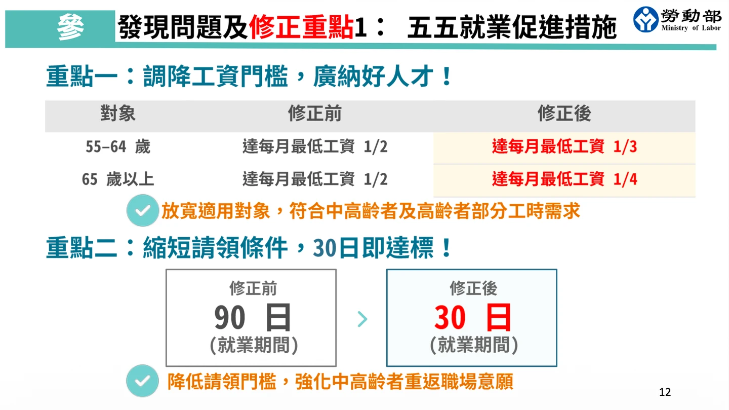 勞動部說,考量現行勞動市場職缺工時多樣化,及彈性工時有助於中高齡者及高齡者持續留任,因此修正「五五就業促進措施」4項資格條件,首先是因應調降勞工工資門檻,鼓勵勞工積極投入職場,55到64歲及65歲以上部分工時者,工資分別達最低工資的1/3、1/4即可請領獎勵,分別獎勵3500元及2500元。