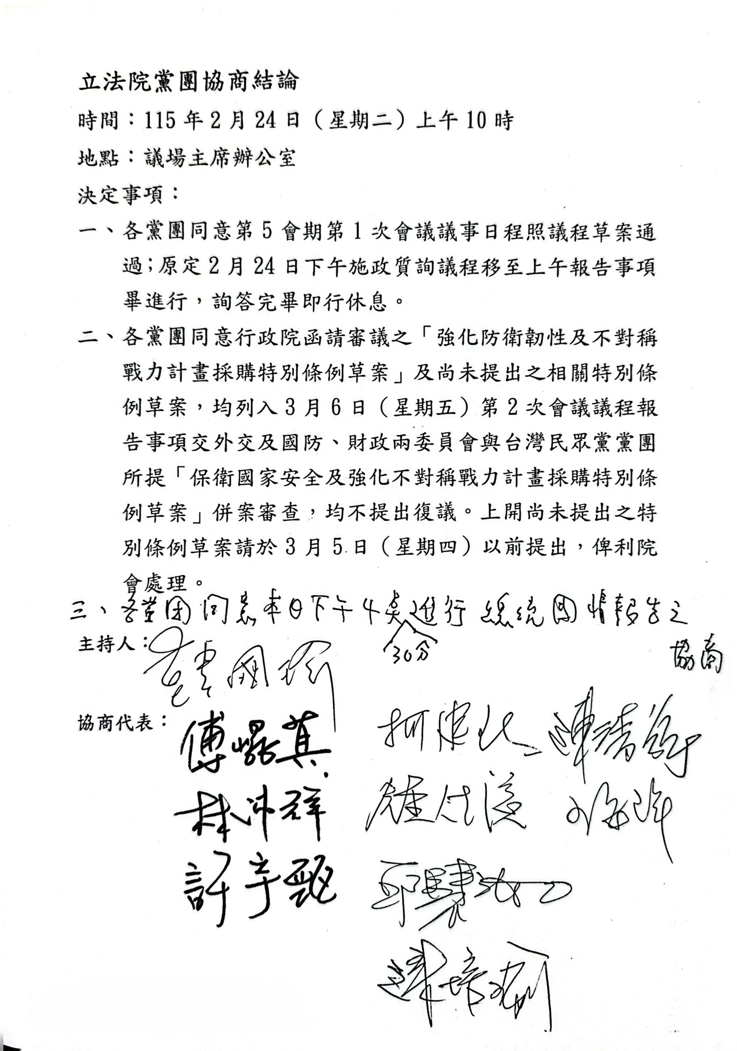 立法院第11屆第5會期24日正式開議,根據黨團協商結論,各黨團同意行政院函請審議之「強化防衛韌性及不對稱戰力計畫採購特別條例草案」及尚未提出之相關特別條例草案,均列入3月6日第2次會議議程報告事項,交外交及國防、財政兩委員會與台灣民眾黨黨團所提「保衛國家安全及強化不對稱戰力計畫採購特別條例草案」併案審查,均不提出復議。尚未提出的特別條例草案,請在3月5日前提出,以利院會處理。