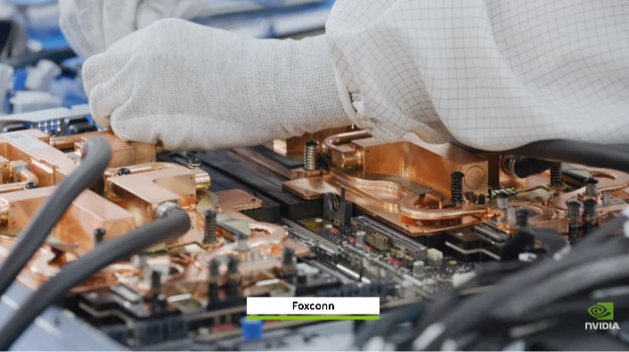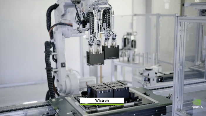在結尾播放的影片中,輝達預告DGX Station將於2026春季上市,合作夥伴有華碩、技嘉和微星。接著又在介紹各款人形機器人時,展示了鴻海切入機器人相關供應鏈。
