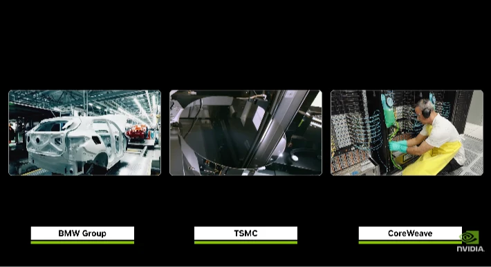 黃仁勳登場後在演講中感謝「那些讓輝達(Nvidia)成為可能的產業,讓輝達的技術能有極高的複雜度與實力,來幫助客戶革新他們的產業」,緊接著就在介紹西門子與實體AI的影片中,展示了緯創、鴻海和台積電。