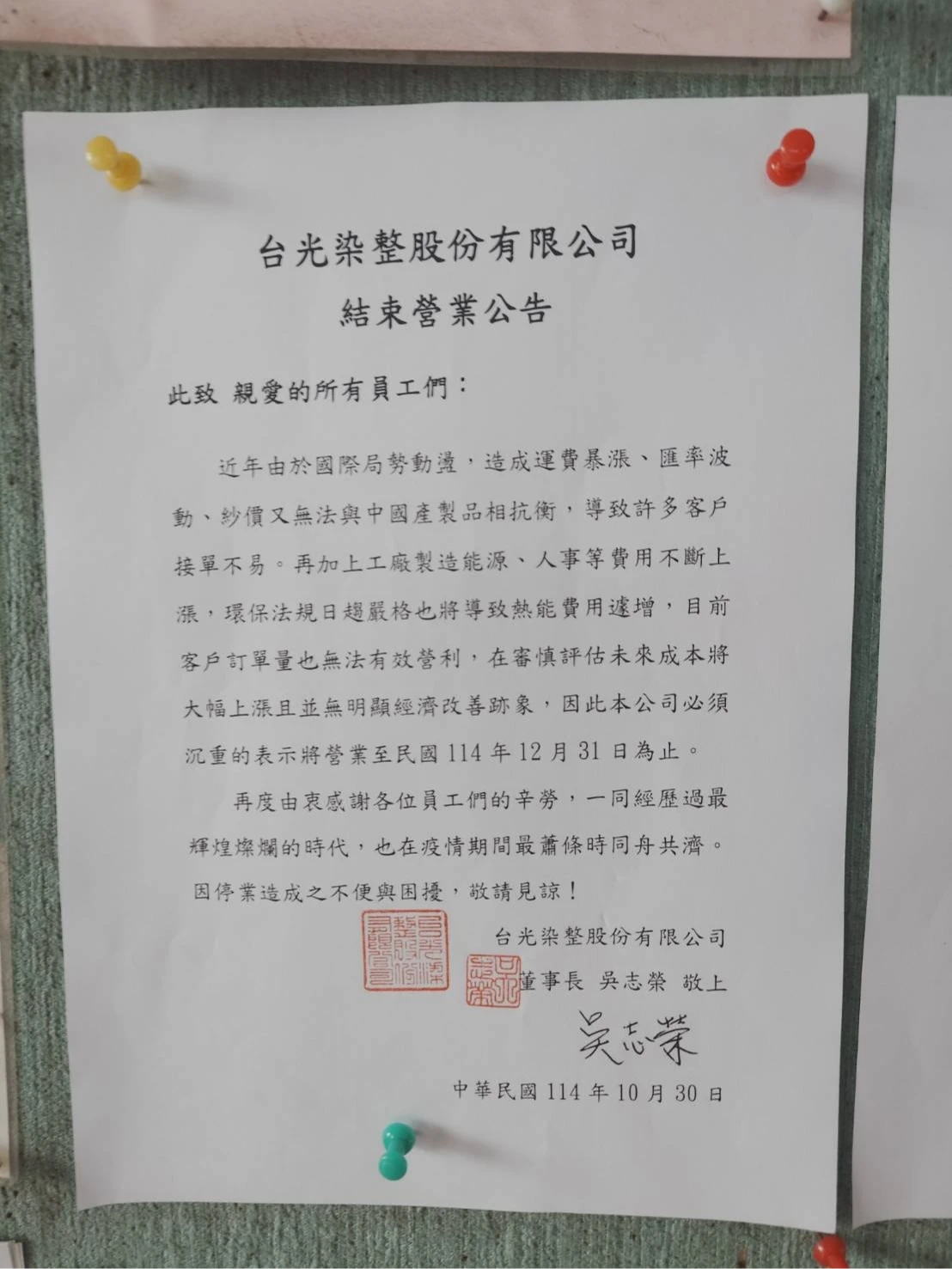 而「台光染整」公告內容寫明,董事長吳志榮致親愛的所有員工,近年由於國際局勢動盪,造成運費暴漲、匯率波動、紗價又無法與中國產製品相抗衡,導致許多客戶接單不易。再加上工廠製造能源、人事等費用不斷上漲,環保法規日趨嚴格也將導致熱能費用遽增,目前客戶訂單量也無法有效營利,在審慎評估未來成本將大幅上漲且並無明顯經濟改善跡象,因此本公司必須沉重的表示將營業至民國114年12月31日為止。
