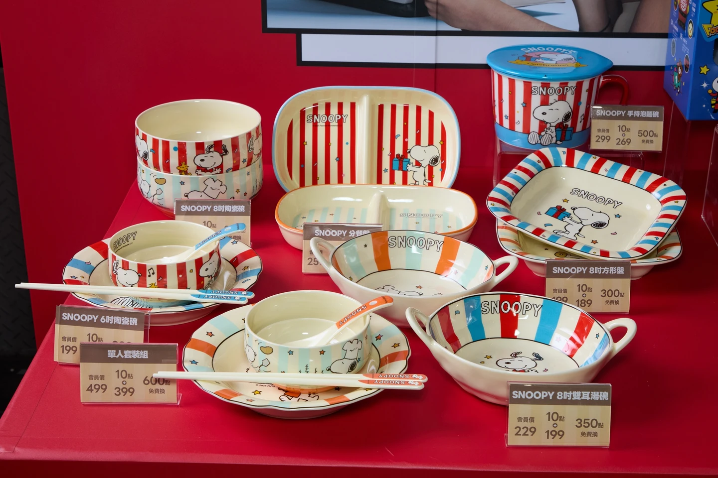 會員還能獨享「SNOOPY點+金」優惠,透過點數加價購或點數免費兌換,即可將SNOOPY繽紛生活餐具系列帶回家,6吋陶瓷碗、手持泡麵碗、8.5吋雙耳湯碗療癒日常用餐時光,另有單人套裝組原價999元、會員優惠價499元,或使用10點加399元加價購亦是用600點數數輕鬆兌,多元方式滿足收藏與實用需求,線上線下共同沉浸美好購物體驗。