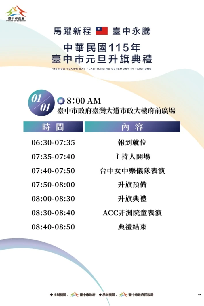 活動流程方面,元旦升旗典禮將由台中女中樂儀隊以精采操槍演出揭開序幕,並邀請霧峰、沙鹿、太平及南區等4區吉祥物(山、海、屯、城代表)引領市長及貴賓進場,民眾也可在吉祥物身上發現暗藏數字「8」的巧思與驚喜。此外,社團法人中華民國阿彌陀佛關懷協會(ACC)助養的非洲賴索托院童,將帶來熱情洋溢的非洲舞蹈與高難度功夫表演,透過文化交流,為新年注入溫暖與希望。