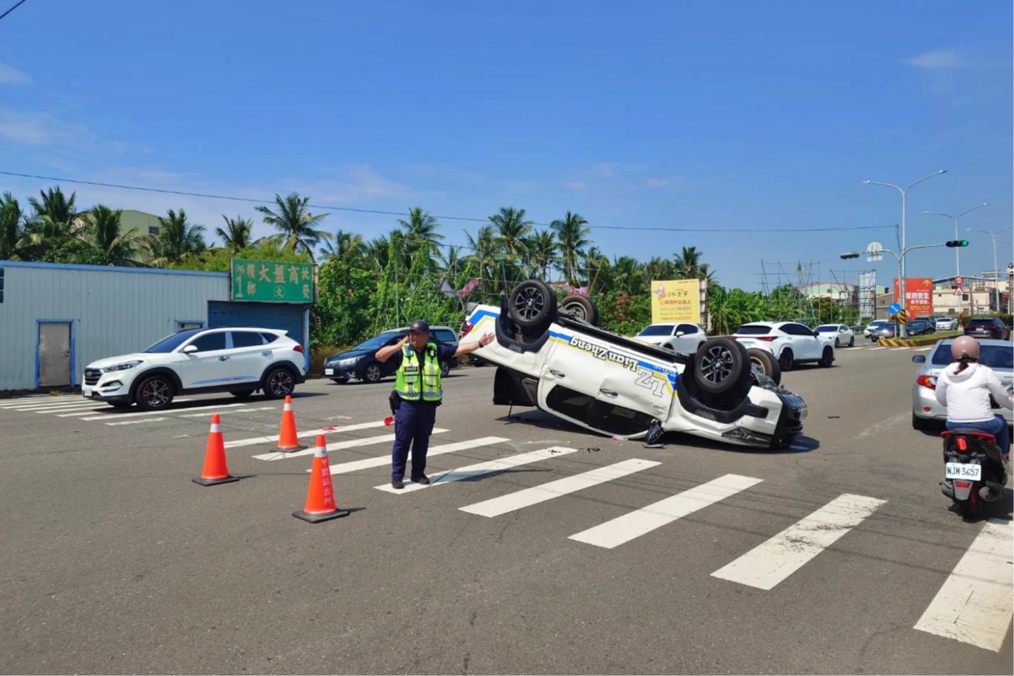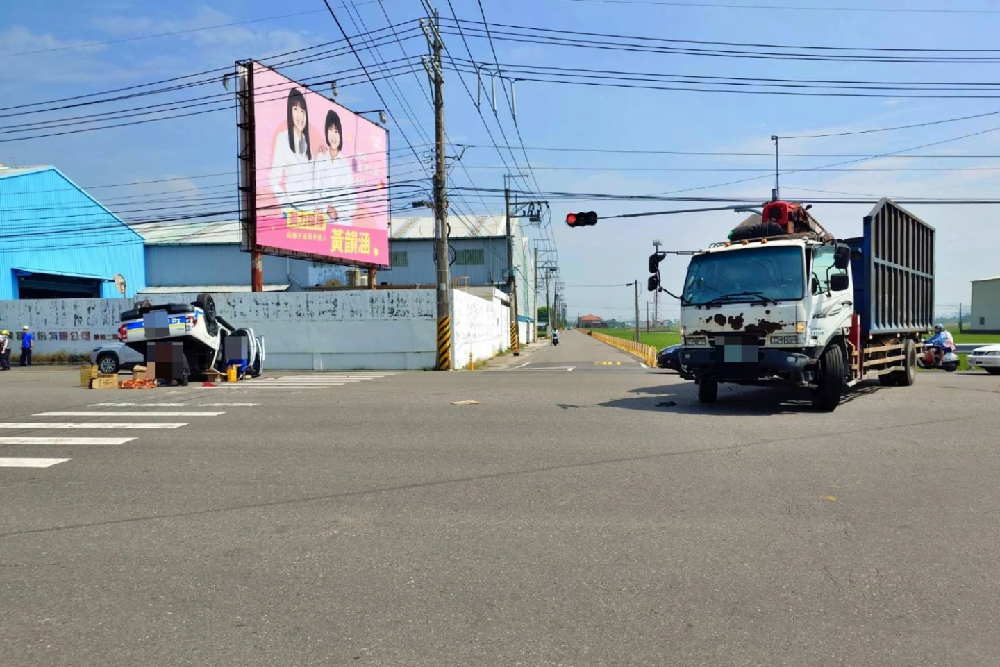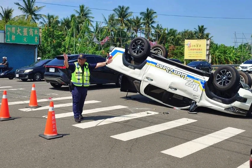 強大的撞擊力導致白車失控翻覆,所幸吳男意識清楚,自行爬出車外,僅手腳擦挫傷,將自行就醫;大貨車駕駛林男則沒有受傷。