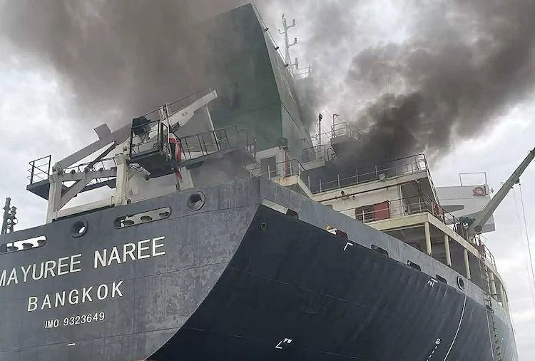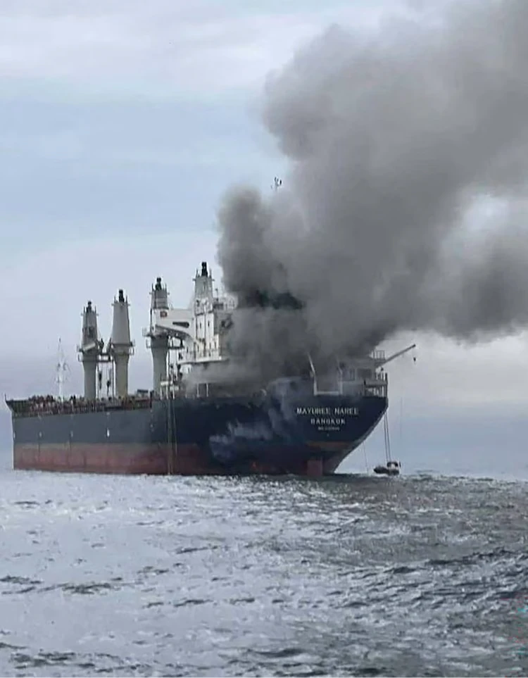 由泰國皇家海軍於2026年3月11日拍攝並發布的新聞圖片顯示,泰國散裝貨輪Mayuree Naree在荷姆茲海峽附近遭攻擊後,濃煙升起。泰國海軍表示,這艘行經荷姆茲海峽的散裝貨輪於3月11日遭到攻擊,目前已有20名船員獲救。法新社