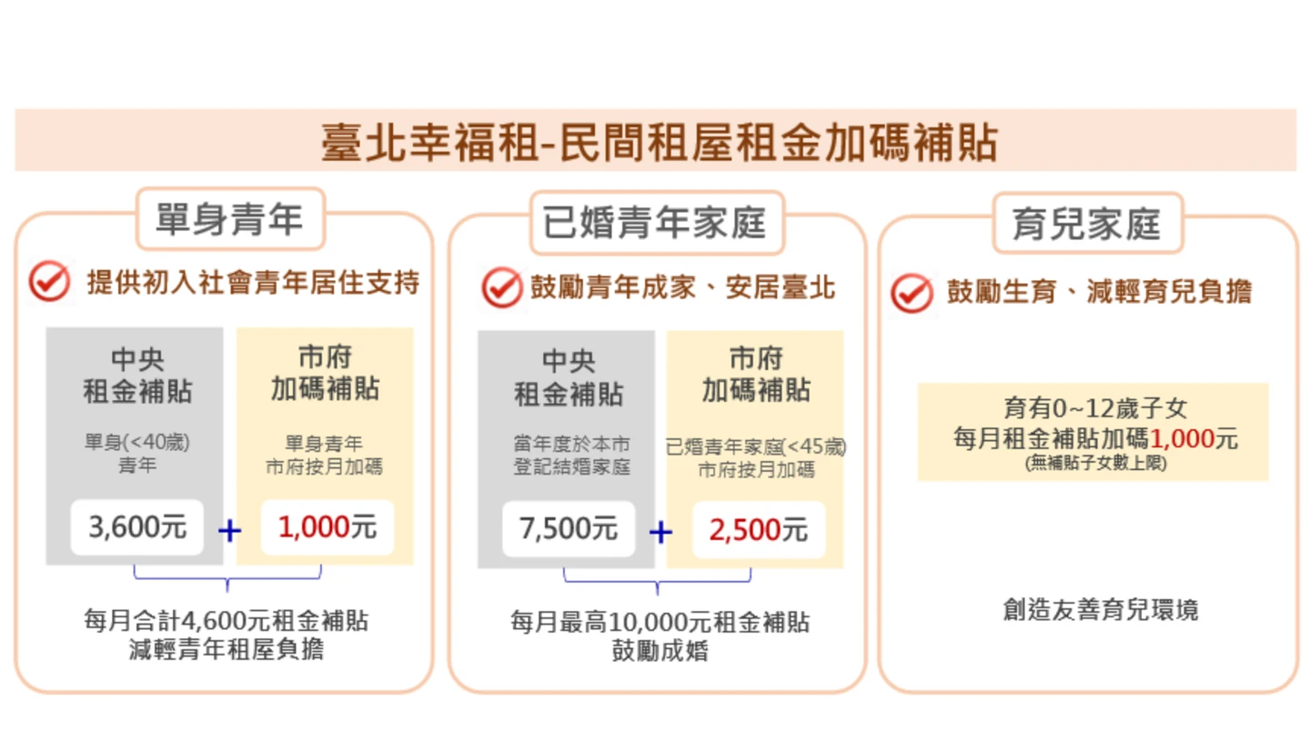 台北市都發局針對在台北市一般租屋市場租屋之「單身青年」「已婚青年家庭」與「育兒家庭」,於獲准中央「300億元擴大租金補貼專案」並在台北市設籍的前提下,推出「台北幸福租-民間租屋租金加碼補貼」。