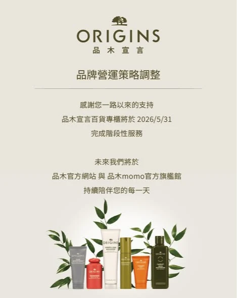 品木宣言今透過社群平台宣告,「因品牌通路營運策略調整,品木宣言百貨專櫃將於2026/5/31 結束服務,我們將告別百貨櫃點,但不會離開你的生活」、「未來我們將於品木官方網站與品木momo官方旗艦館,持續陪伴您的每一天」。