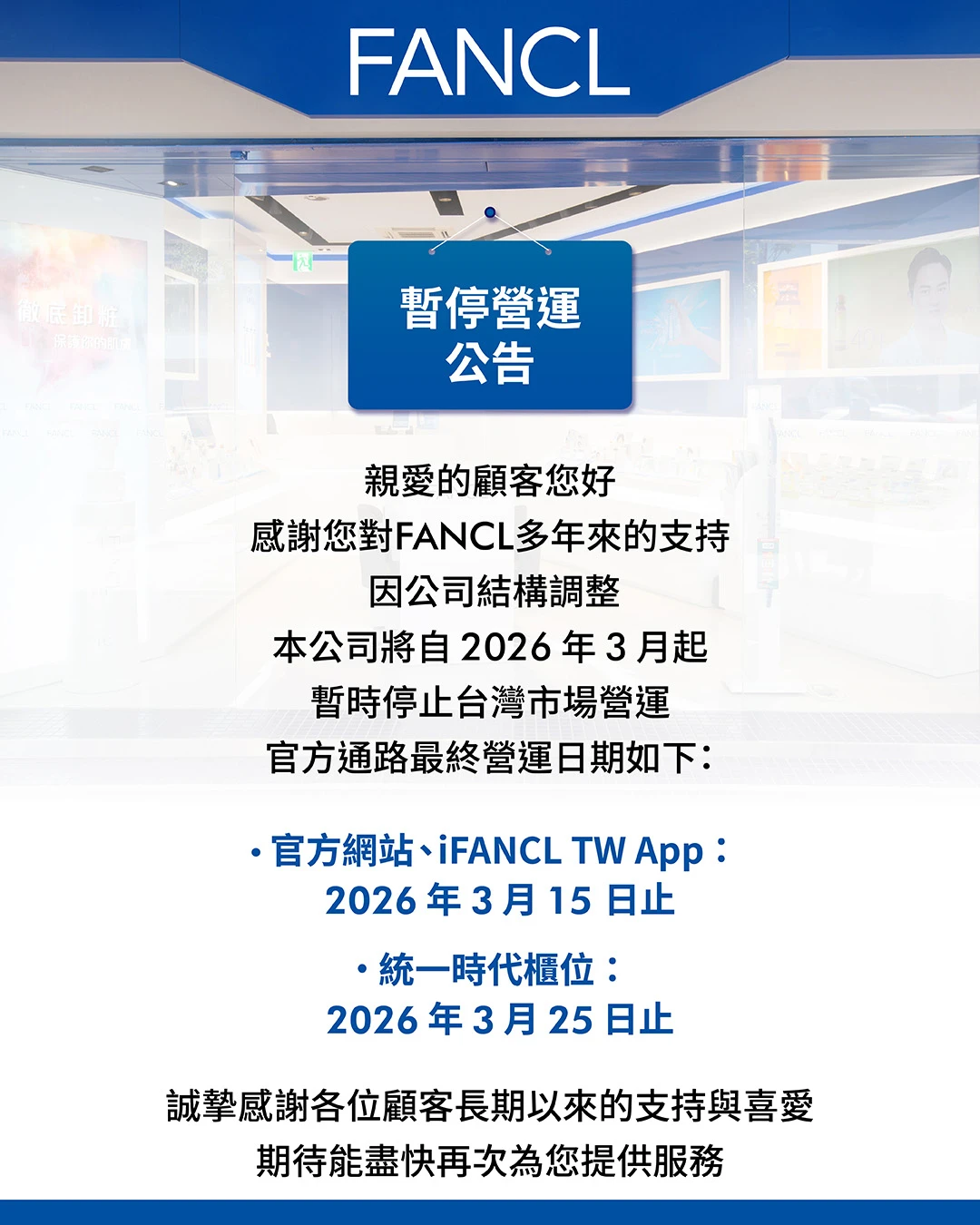 日本保養品牌FANCL在今年2月底公告,「因公司結構調整,本公司將自 2026 年 3 月起暫時停止台灣市場營運」,官方通路最終營運日期:
