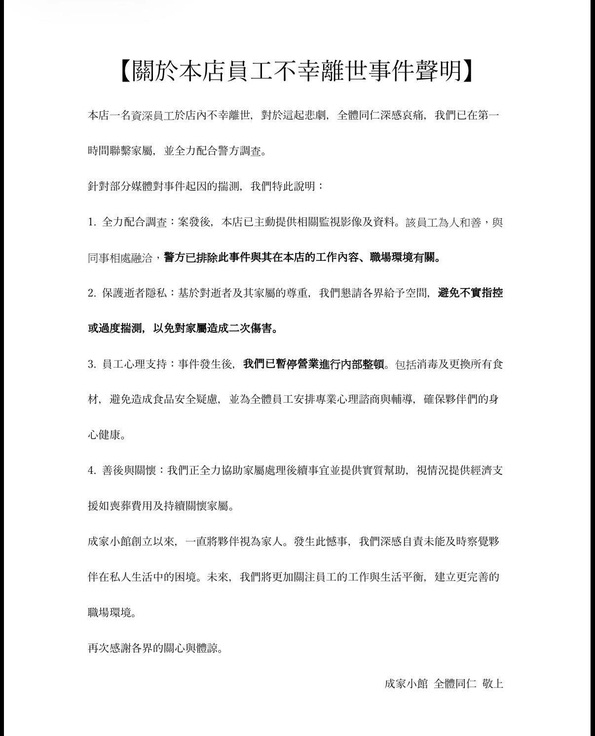業者也透過臉書粉專「成家小館-木新創始店」24日深夜表示,本店一名資深員工在店內離世,對於這起悲劇,全體同仁深感哀痛,第一時間聯繫家屬且全力配合警方調查。發表4點聲明: