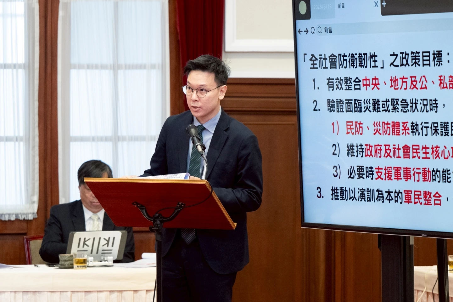 總統府全社會防衛韌性委員會今下午展開第7場會議,林飛帆簡報「2026城鎮韌性整備與推動概況」時說明,全社會防衛韌性政策目標,在於有效整合中央、地方及公、私部門應變量能;驗證面臨災難或緊急狀況時,民防、災防體系執行保護民眾的能力,維持政府及社會民生核心功能持續運作能力,及必要時支援軍事行動的能力;同時推動以演訓為本的「軍民整合」。