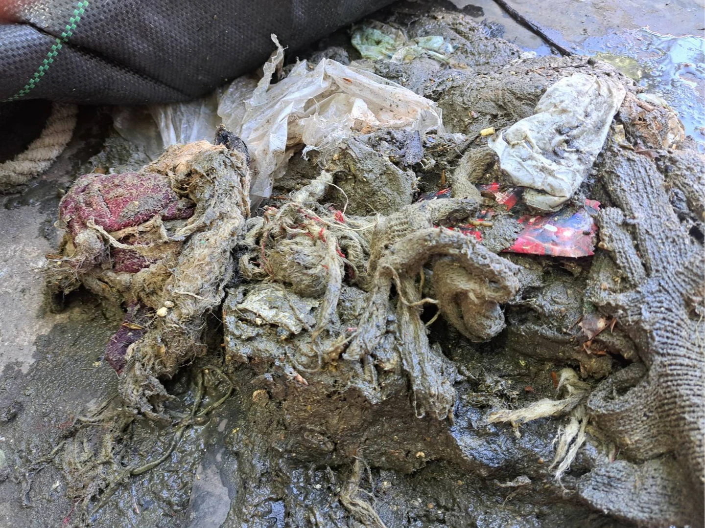 揚水站泵浦清理出大量棉絮、破布與垃圾。新北水利局提供