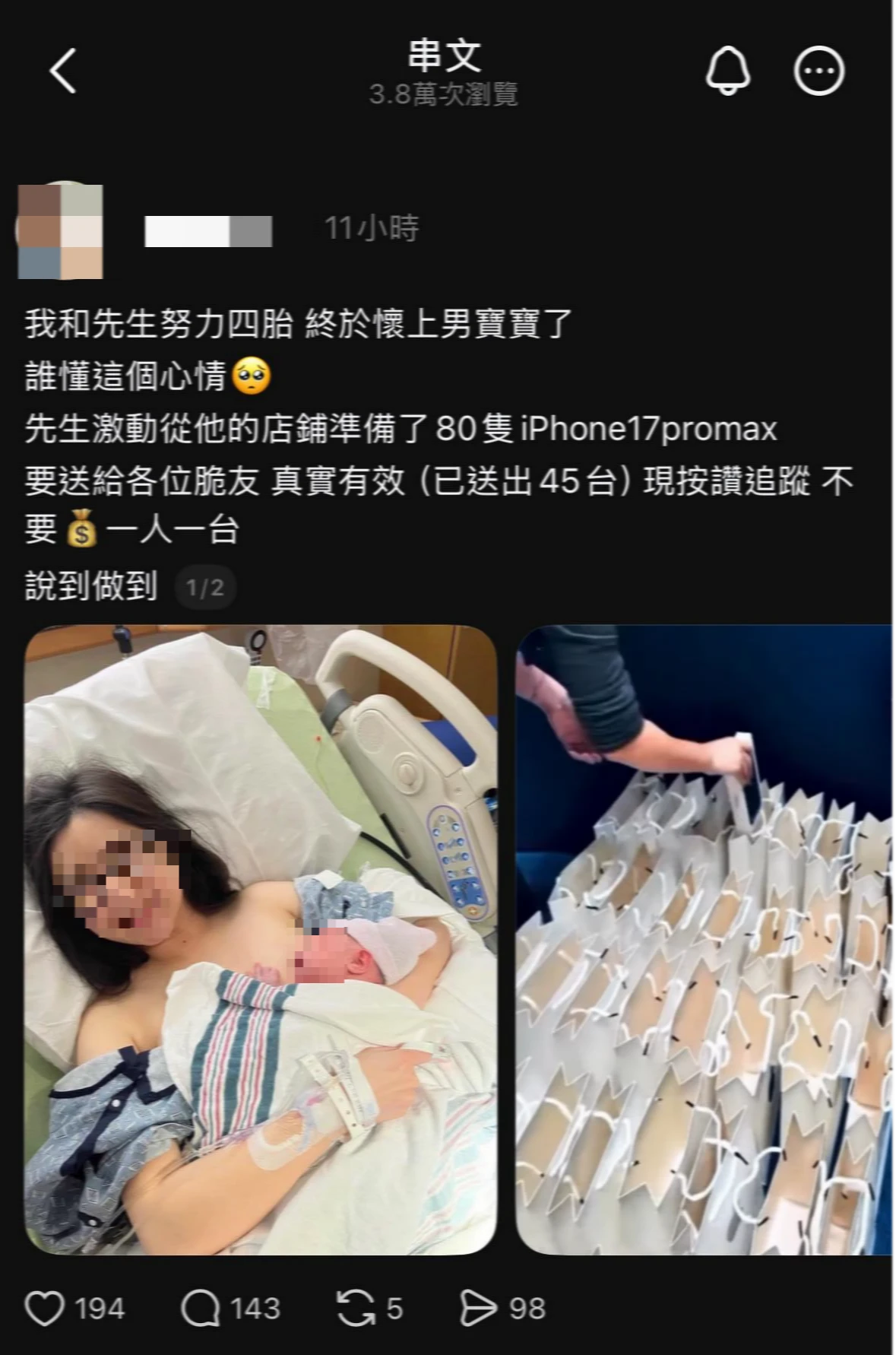 賀生男寶!4寶媽曬哺乳照「尪豪送手機」 律師急發文勸世:別再加1了