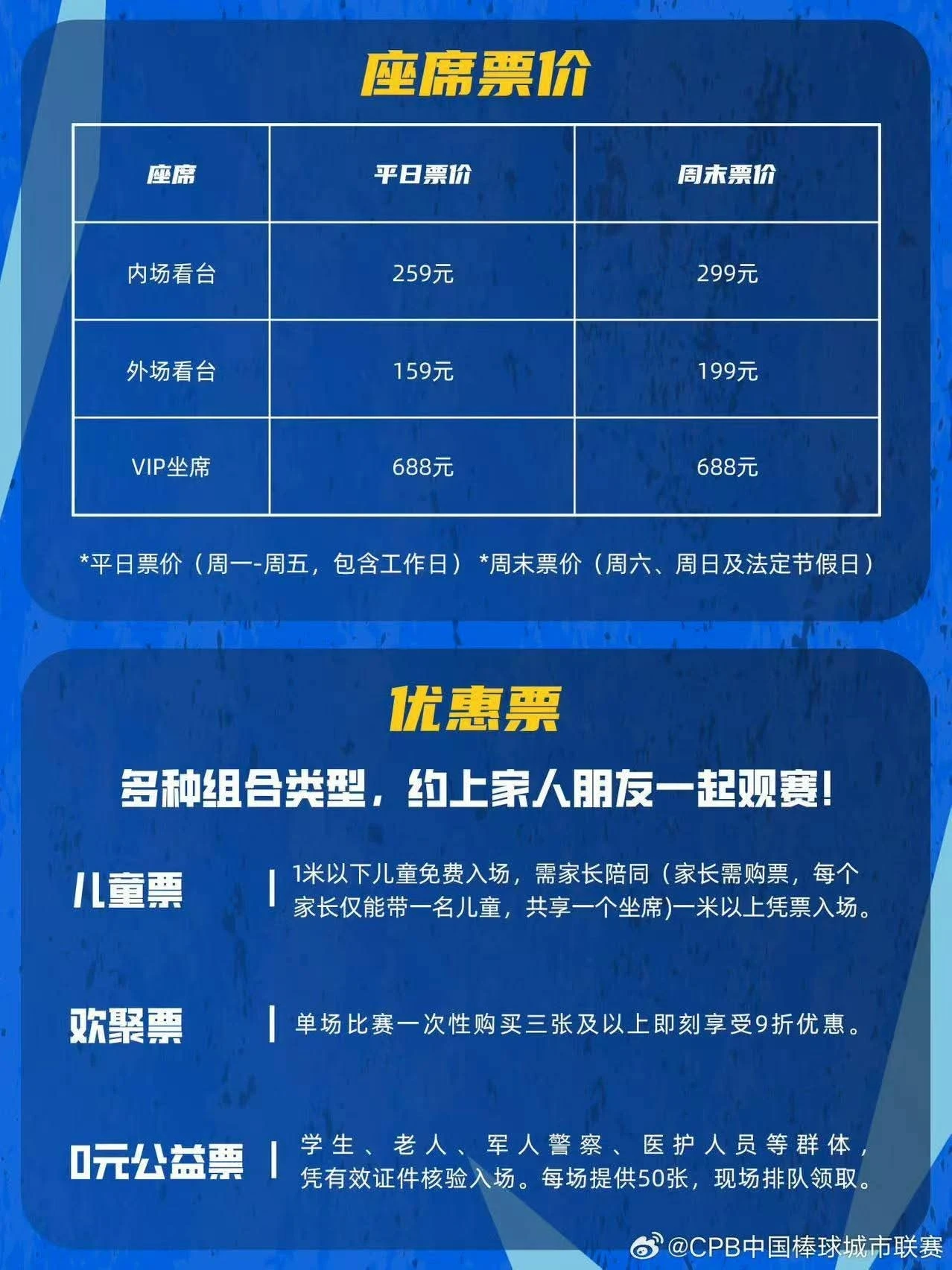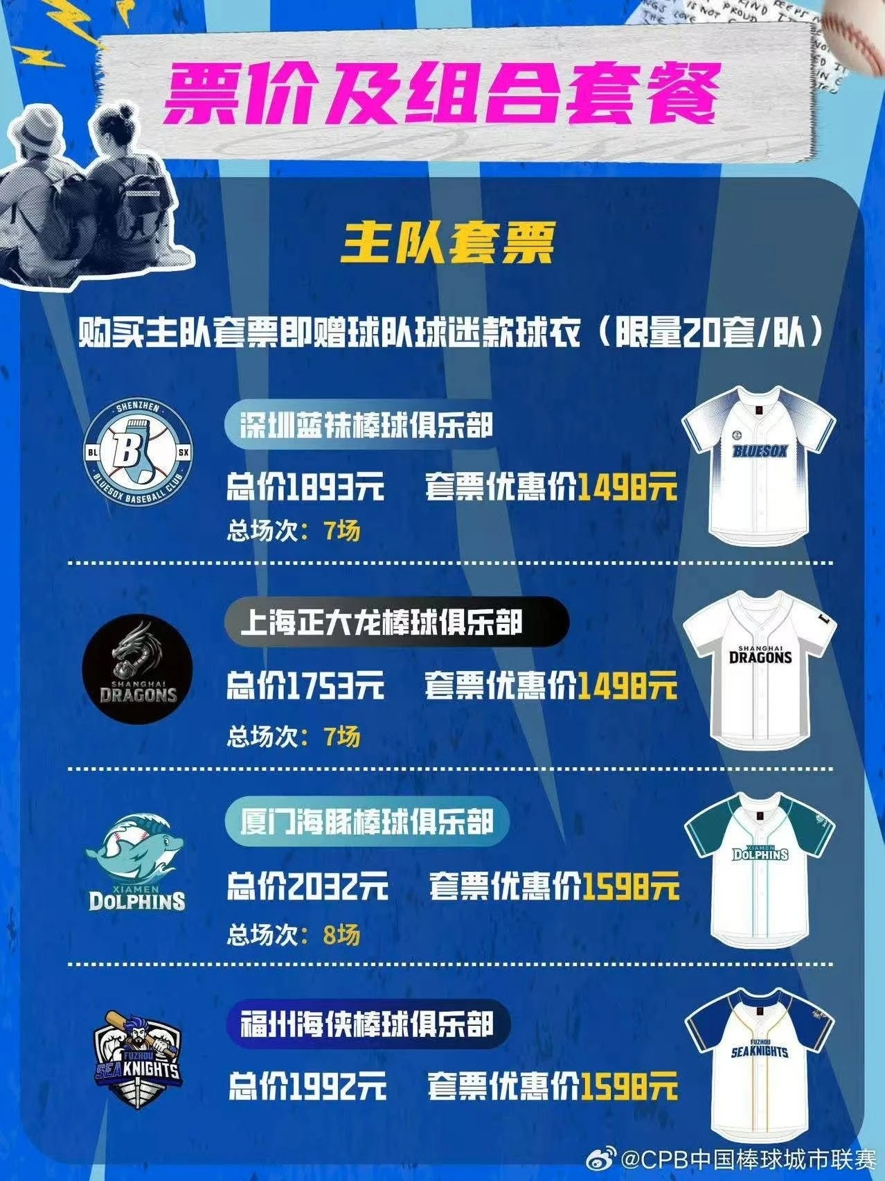 昨聯盟公布1月立春聯賽票價,平日外野159人民幣(約台幣706元)、假日外野199人民幣(約台幣883元)、平日內野259人民幣(約台幣1149元)、假日內野299人民幣(約台幣1327元),VIP席不分平假日688人民幣(約台幣3054元)。另推出主隊套票,每隊限量20套,每套票價1498人民幣(約台幣6665元)或1598人民幣(約台幣7110元),買就送該主隊球迷版球衣。