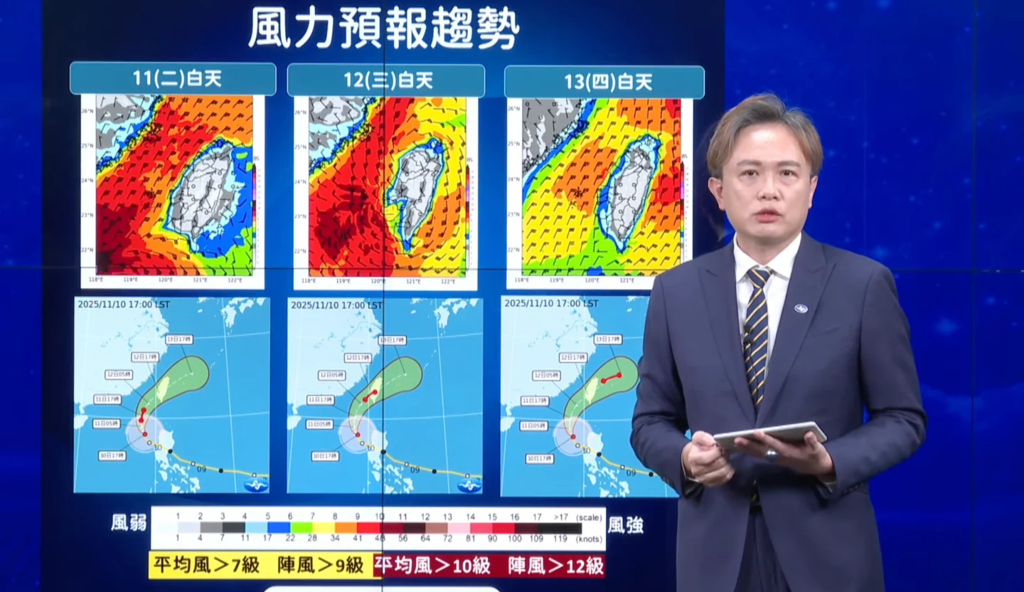 到了周三(12 日)白天,隨著颱風更接近甚至靠近台灣西南陸地,台灣附近的風力將明顯增強。若颱風登陸,西南地區陸地風力在中心附近有可能來到 9 到 12 級左右,需特別注意。周四(13 日)白天颱風遠離,由東北季風取代,沿海地區、蘭嶼綠島、離島地區仍可能會有 8 到 10 級的強陣風。