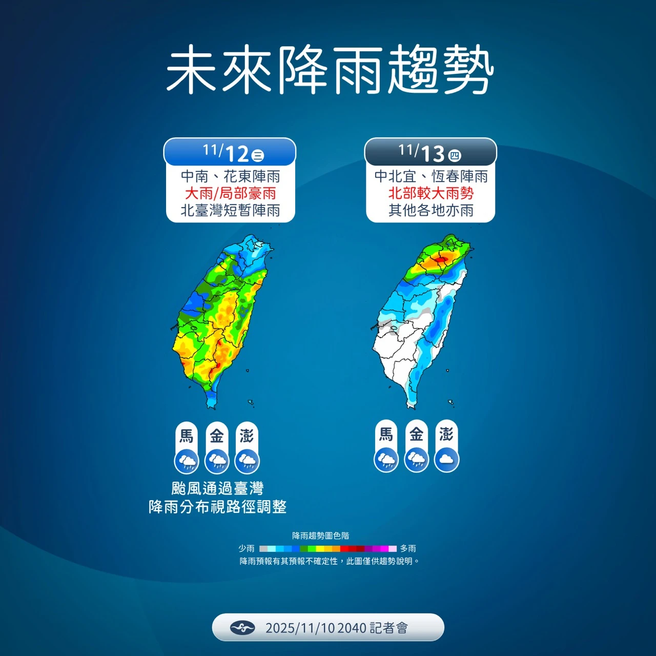 周三到周四:颱風逐漸遠離,轉為東北風或北風影響。北部地區仍有一些局部較大雨勢,但中南部及東半部地區的降雨會比周三緩和許多。