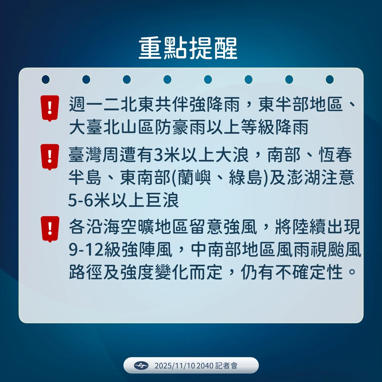 浪況方面,從明天白天到周三白天這段時間,台灣附近依舊容易有 3 米的浪高。隨著颱風持續北上, 6 米浪高的範圍會逐漸擴大,包含在南部地區、澎湖等都要注意。氣象署提醒,南部恆春半島、東南部的蘭嶼綠島以及澎湖,可能都會有 5 到 6 米以上巨浪出現,請避免前往海邊活動。