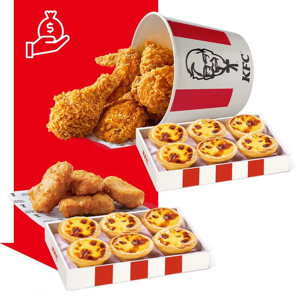 超值分享組合「$388歡聚桶」重磅登場,內含咔啦脆雞5塊+原味蛋撻6入(優惠代碼:50481),原價637元、現在只要388元。若是只購買原味蛋撻6入禮盒,再贈4塊上校雞塊(優惠代碼:40649),特價205元。