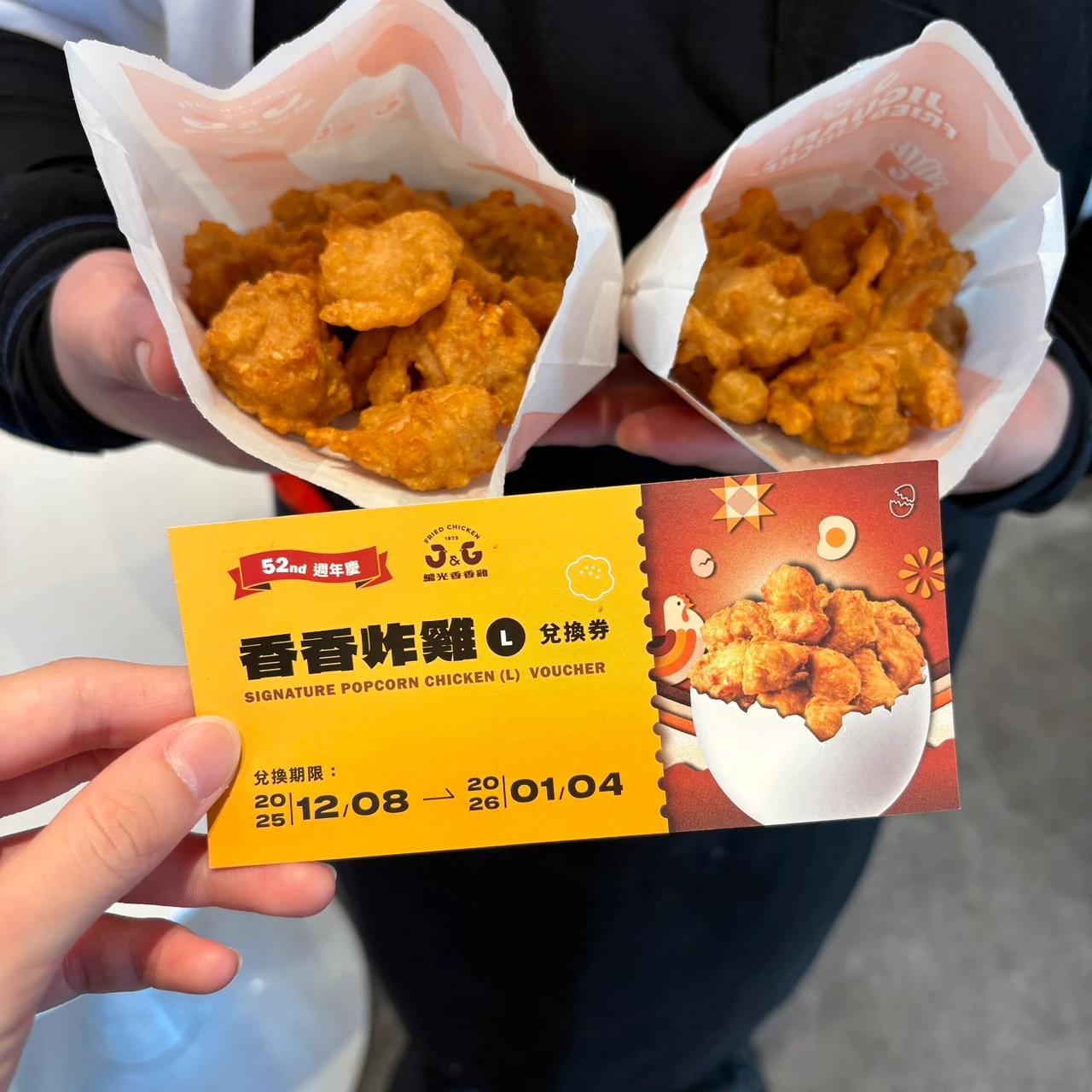 即日起至12月7日「香香炸雞」買1送1,凡買1份「香香炸雞XL (原價170元)」贈「香香炸雞L (原價130元)」兌換券1張;同時,呼應品牌52週年慶,再加價「52元」可再獲得1份「(海苔)墨魚甜不辣 (原價70元)」。