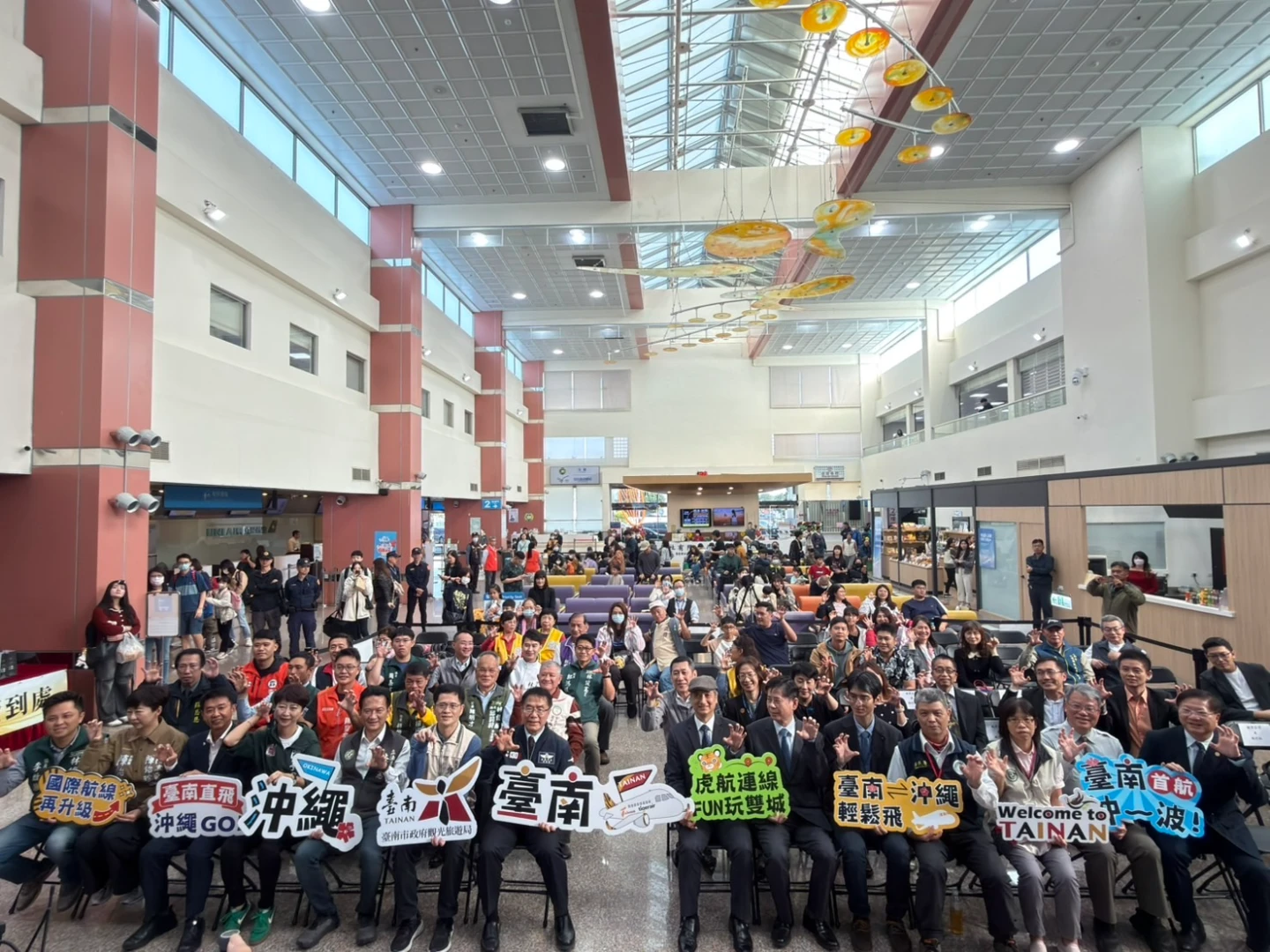 今(25)日台南機場舉辦首航慶祝儀式,台南市市長黃偉哲、台南市政府觀光旅遊局副局長鄭道立、交通部民用航空局台南航空站主任楊益瑞等多位長官及貴賓齊聚一堂,台灣虎航總稽核宋仲奮亦代表出席首航啟動儀式。