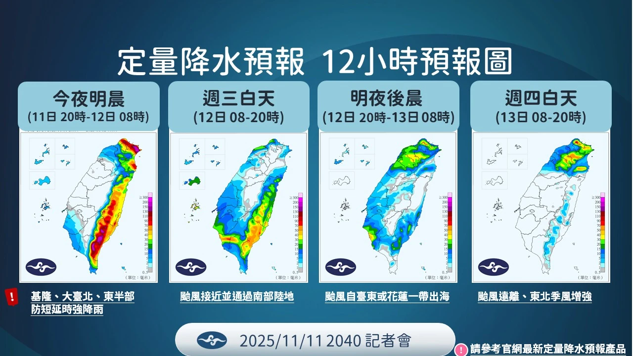 林秉煜強調,在今天晚上到明天白天這段時間,由於颱風外圍環流、東北季風與地形的交互作用,特別需要注意宜蘭、新北地區,甚至大臺北山區,可能會有短延時強降雨。從雨量預估色塊可見,這類強降雨在基隆北海岸、大臺北地區或宜蘭地區,今天晚上到明天清晨都需特別注意。颱風外圍環流也會給花東帶來一些強降雨。