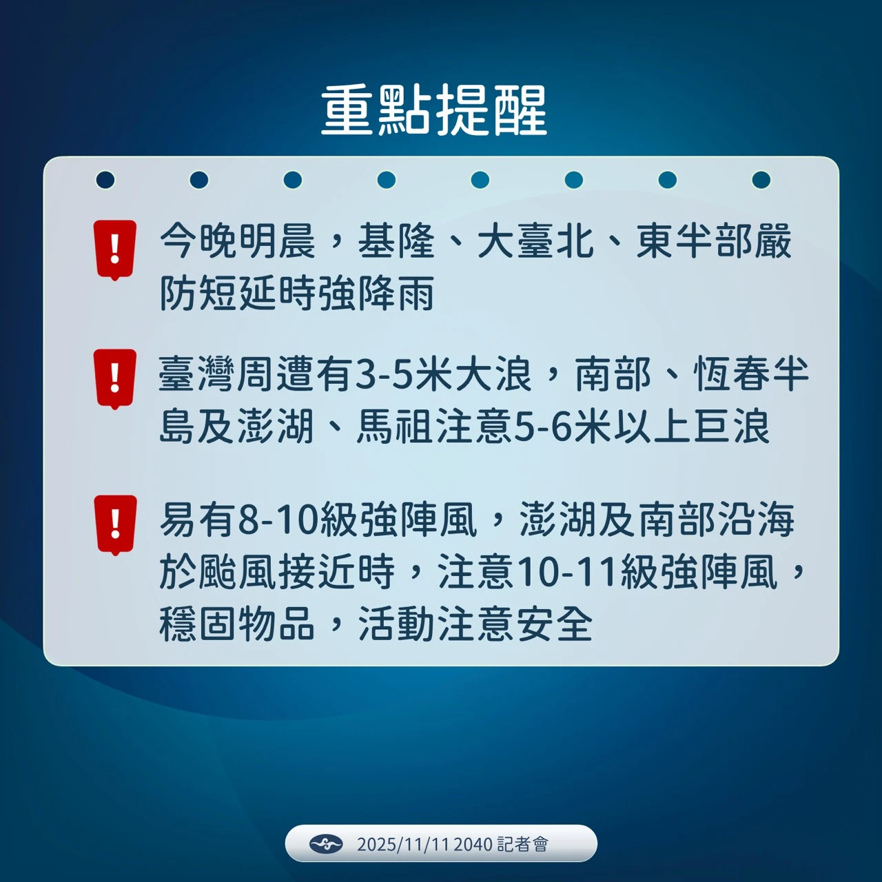 氣象署最後提醒,從今天晚上到明天清晨,特別注意宜蘭、基隆北海岸、大臺北地區,甚至花東地區,可能會有短延時強降雨,時雨量大,可能造成低窪地區有積淹水情形發生。臺灣周遭有3到5米大浪,南部、恆春半島、澎湖、馬祖甚至可能出現5到6米左右的浪高。各地易有8到10級的強陣風,明天在颱風接近的過程,澎湖與南部沿海地區可能有10級左右的強陣風,請民眾特別留心。