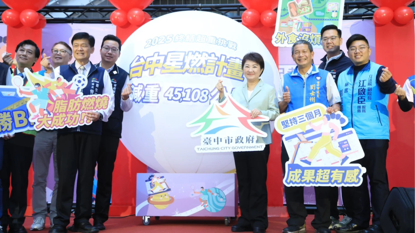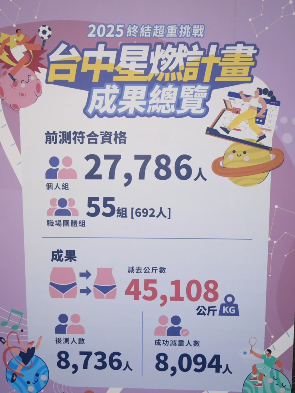 【記者王煌忠/台中報導】為提升市民健康意識,台中市府在6月啟動為期三個月的「2025台中星燃計畫 終結超重挑戰」,參加對象以BMI超過24的市民,市長盧秀燕當時特別點名體重破百的副市長鄭照新參加,希望看到他重返年輕時號稱「張信哲」帥樣,今天成果揭曉並舉辦頒獎,市府表示,此次活動共吸引2萬7786名市民響應,總計8000人成功達標,累計減掉4.5萬公斤,衛生局長曾梓展也成功減重8公斤,而備受矚目的鄭照新則因減重失敗,缺席頒獎活動。