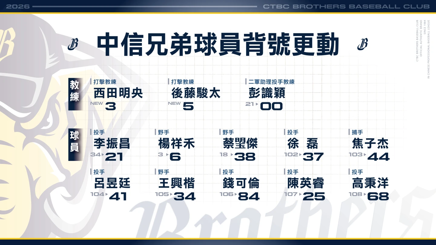 而去年球季後被放在60人名單外的左投彭識穎,新球季將轉任二軍助理投手教練,從21號改穿「00」號,以全新角色協助球隊培育投手戰力;內野手楊祥禾也將從3號更換為6號,持續進化、迎向新的挑戰。
