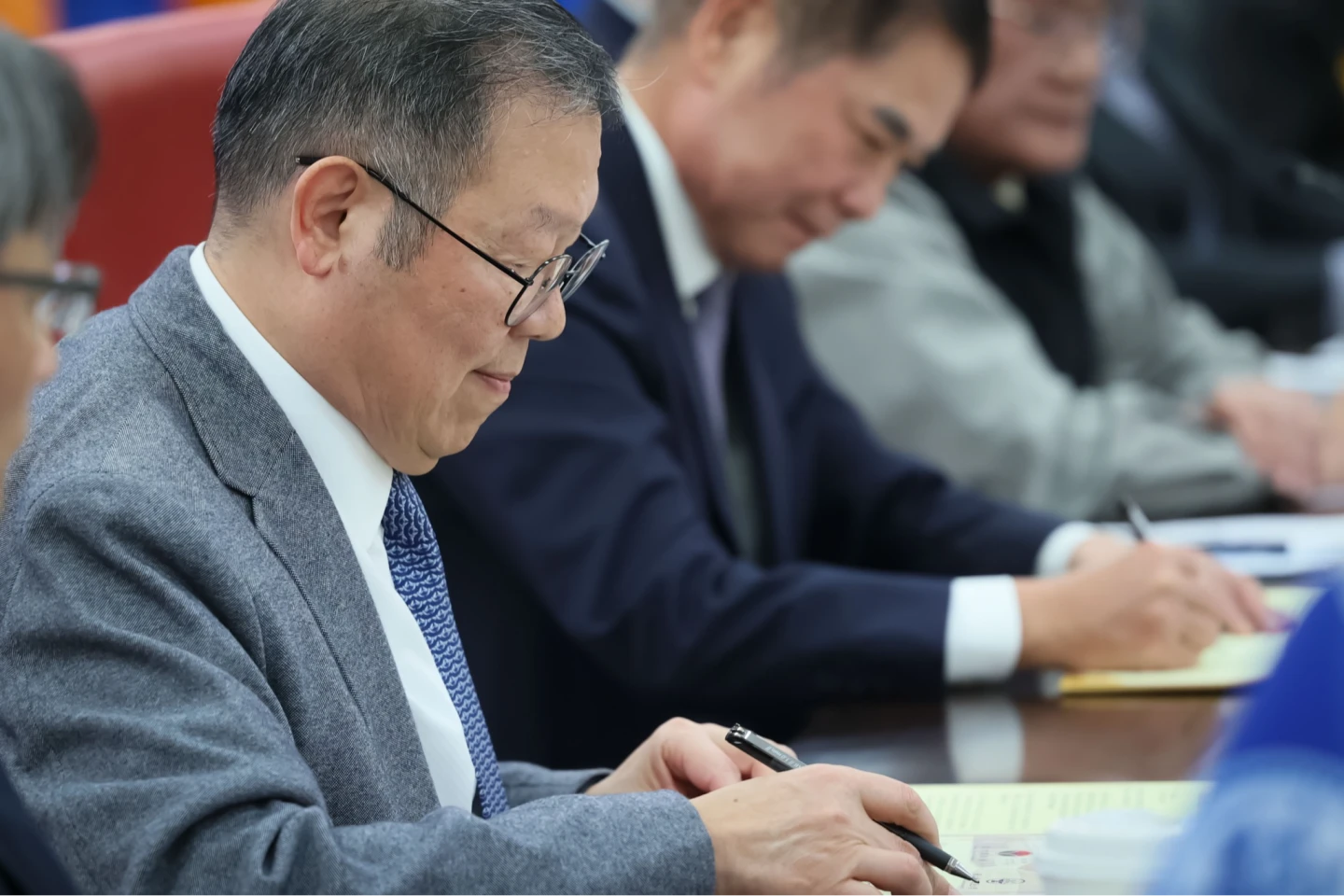 陽明交大校長林奇宏、副校長陳永富的學校團隊及附中校長陳瑞榮昨赴苗栗縣政府,與鍾東錦、縣府教育處長葉芯慧等一級主管,簽署合作協議。