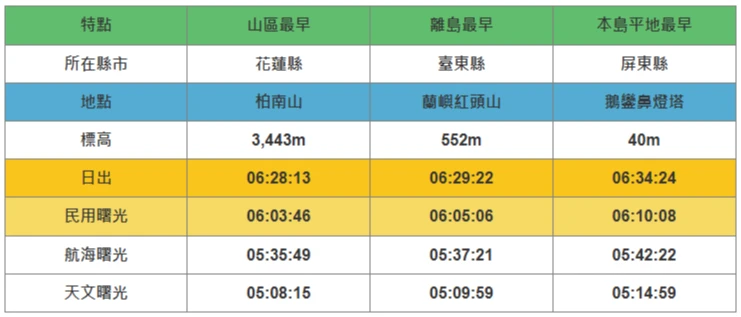 2025年即將結束,2026年第一道曙光和日出都在花蓮。台北天文館精算指出,2026年元旦第一道民用曙光將在清晨6時3分46秒出現於花蓮縣柏南山,而全國最早日出也於6時28分在柏南山現身。