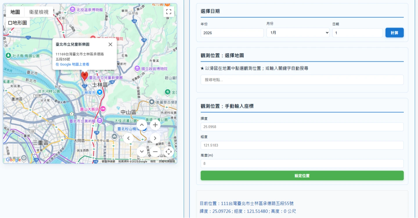為了讓大家精準掌握元旦各地曙光與日出的時刻,台北天文館特別製作了線上互動程式「2026年元旦曙光地圖(點這裡)」,只要在地圖上點選觀賞地點,接著按下「計算」,就會出現該地的曙光與日出時間。