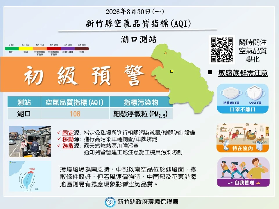 台中市府、新竹縣政府皆在臉書發文,提醒空氣品質達初級預警等級,主要指標污染物為細懸浮微粒(PM2.5),提醒敏感族群者應隨時注意自身狀況,並配戴好口罩,外出時留意空氣品質狀況。