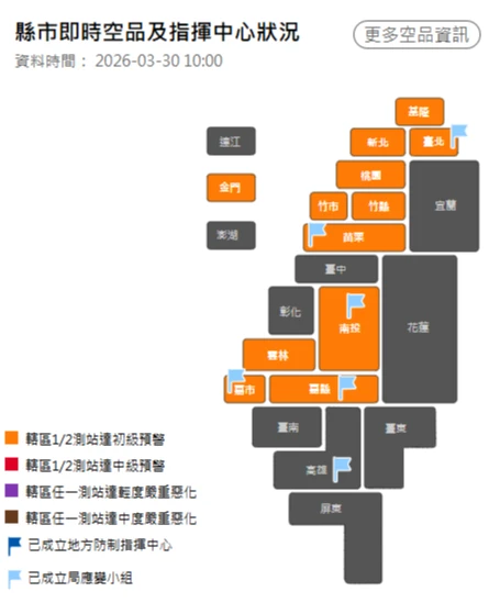 根據環境部空氣品質預報資訊今天上午10時資料顯示,全台12縣市都已達初期預警,包括基隆、台北、新北、桃竹苗、南投、雲林和嘉義等縣市。