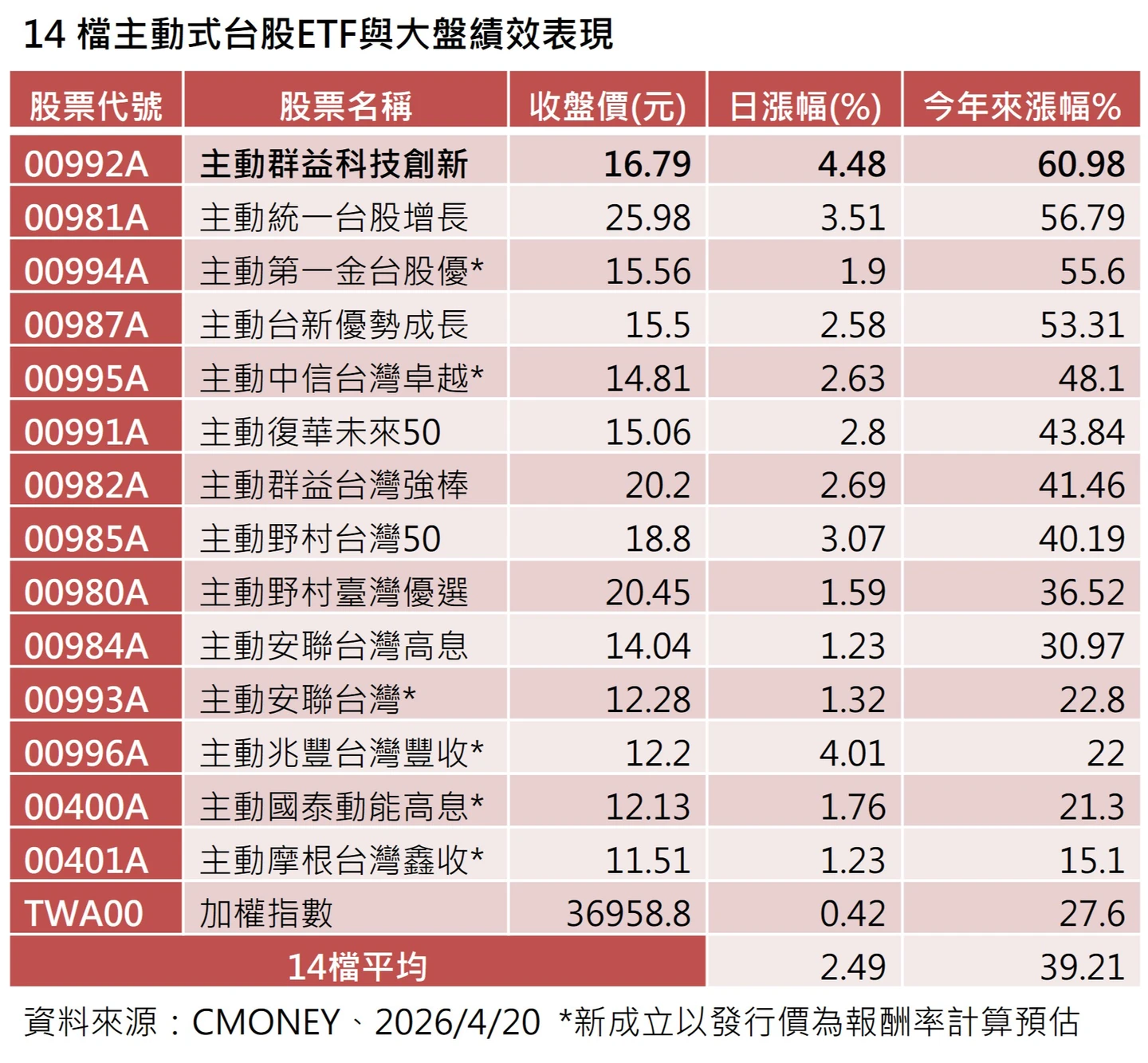 【記者吳珍儀/台北報導】大盤18日上漲0.42%,不過市場投資新寵主動式台股ETF單日漲幅全數勝大盤,其中最高單日漲幅為主動群益科技創新00992A上漲4.48%表現亮麗,今年來表現來看,14檔平均漲幅為39.21%打敗大盤的27.6%,再以單檔表現來看,主動群益科技創新00992A今年來上漲60.98%漲幅居冠。