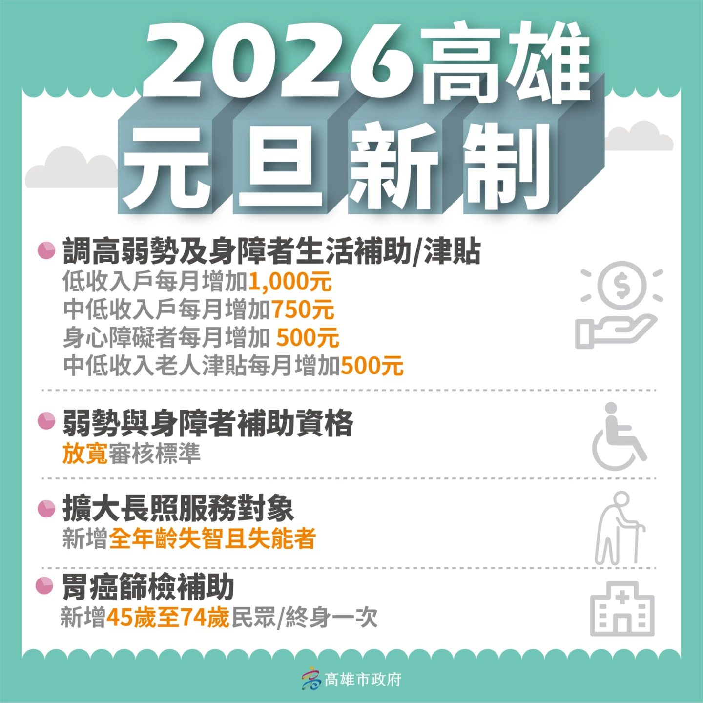 為照顧弱勢族群及提升勞工權益,高雄市政府自2026年起對於低收入戶、中低收入戶、身心障礙者、中低收入老人及弱勢單親與兒少資格審核標準進一步放寬,並針對以上族群每月加發500元至1000元不等之補助,減輕高雄市的長者及弱勢族群家庭經濟負擔。